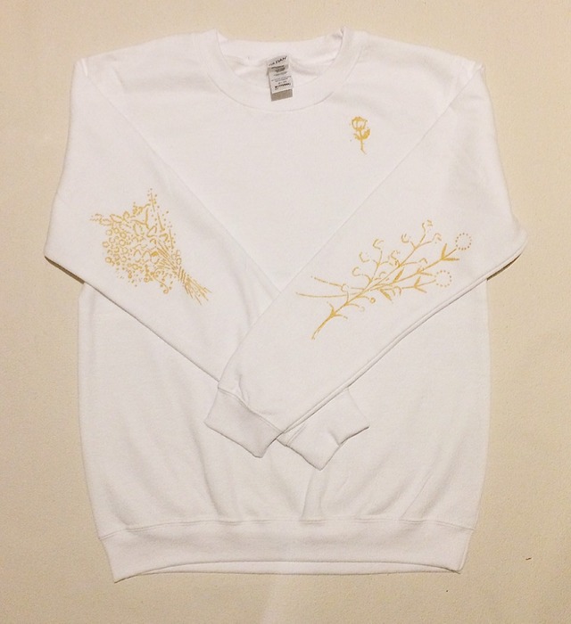 胸元にバラ、両腕に花束。 完全手刷りのスウェットです。 色はホワイト、ブラック、ロイヤルブルーの3色。 欠品中のものにつきましては、ご希望の方はサイズ、色など明記し 直接メールにてお問い合わせください。