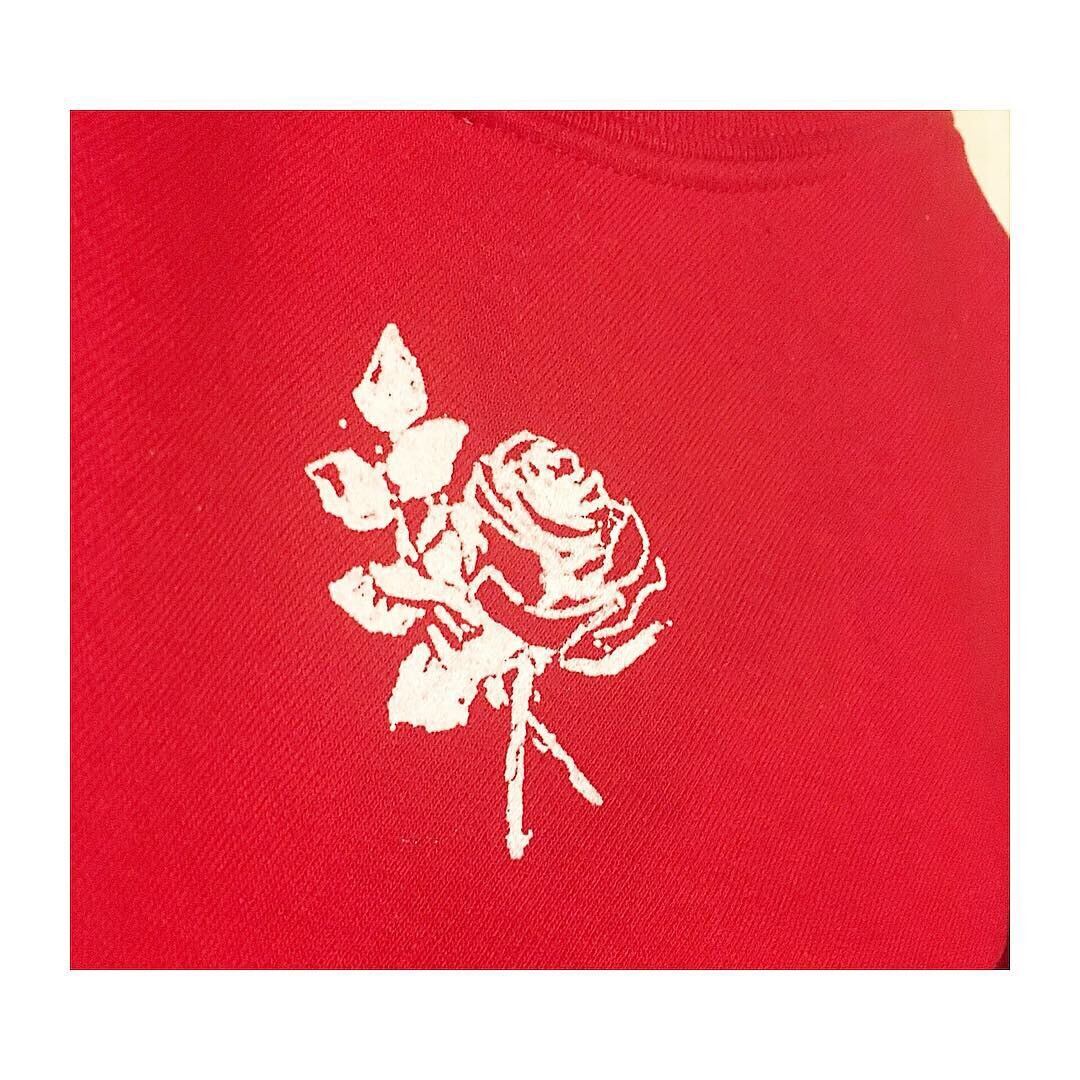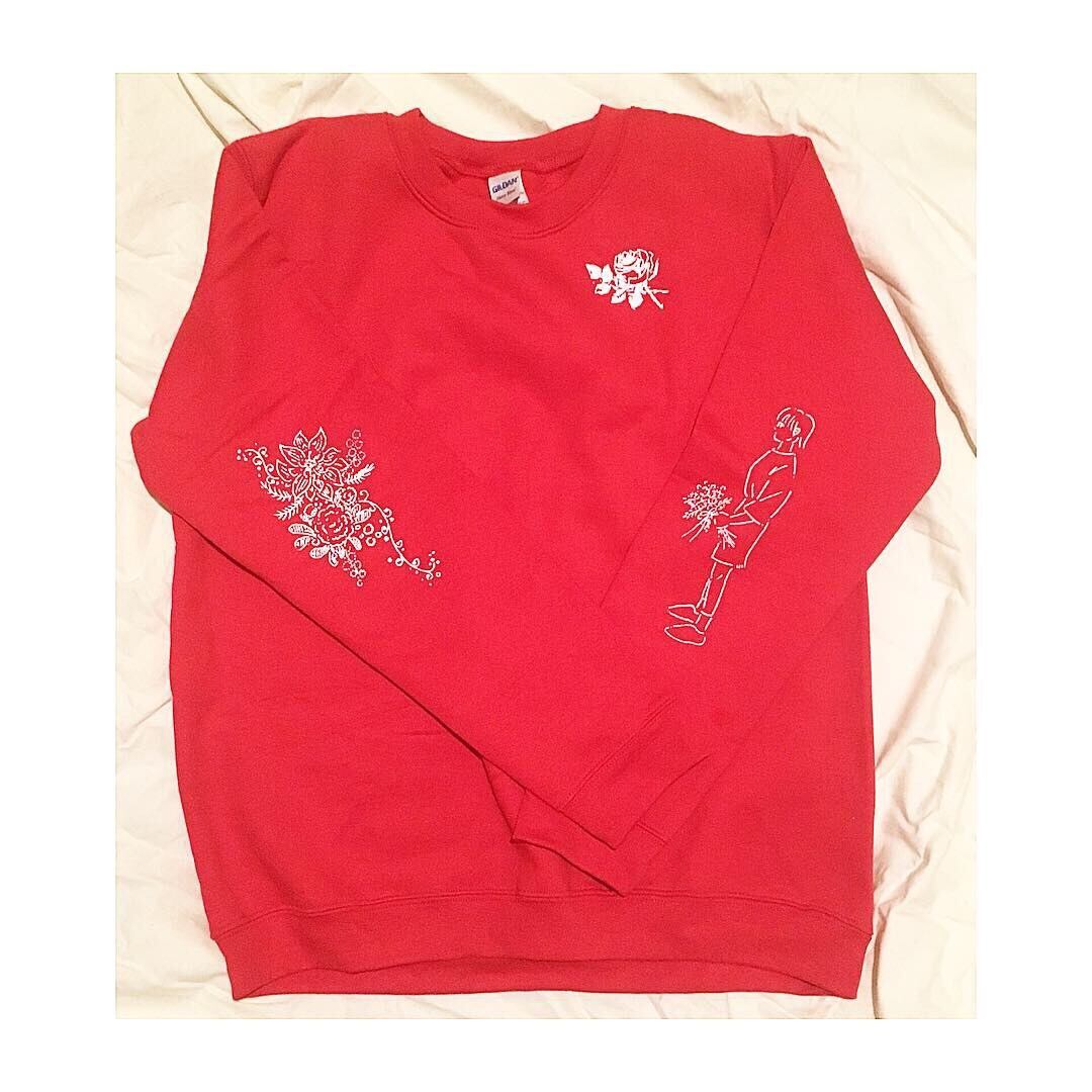胸元にバラ、左腕に花束を持った女の子、右腕にお花。